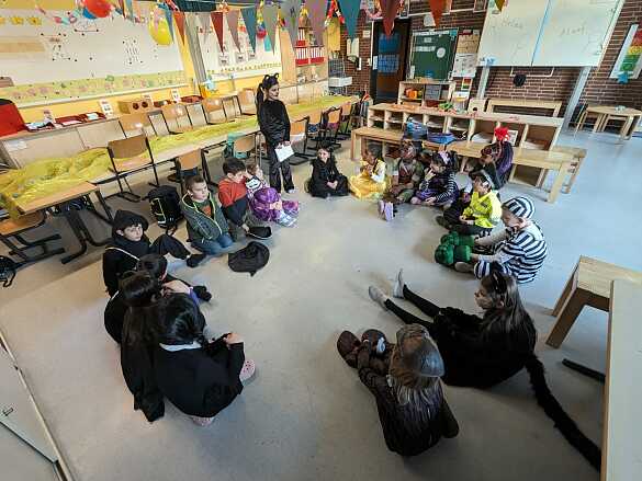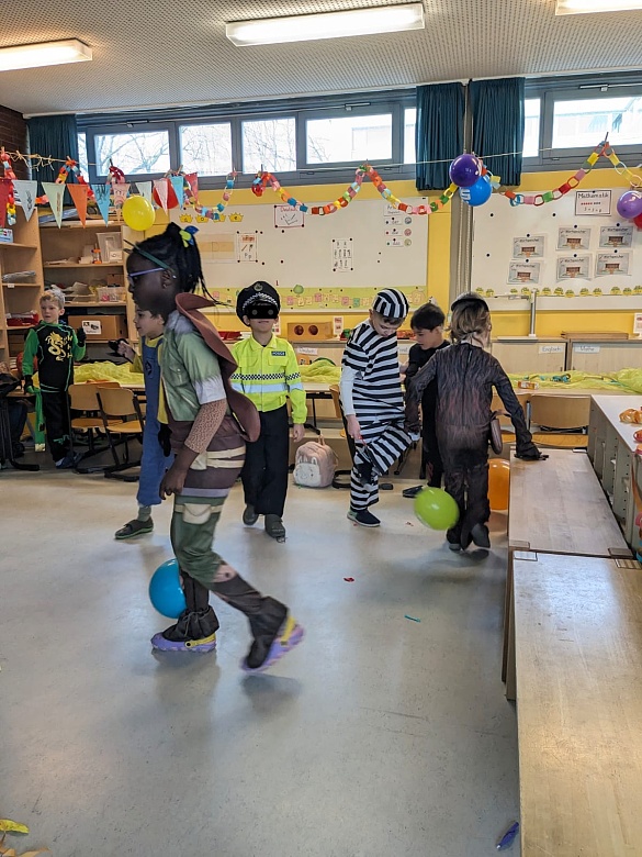 Die Schülerinnen und Schüler der Jahrgangsstufen 1 bis 3 hatten sich in ihren fantasievollen Verkleidungen versammelt und sorgten für eine fröhliche Atmosphäre in unserer Schule. Von strahlenden Prinzessinnen und mutigen Superhelden bis hin zu niedlichen Tierchen und bekannten Märchenfiguren - die Vielfalt der Kostüme war beeindruckend und spiegelte die kreative Energie unserer Schülerinnen und Schüler wider. Die Flure erstrahlten in bunten Farben, während die Kinder in ihren Verkleidungen durch die Klassenräume wirbelten, gemeinsam Spiele spielten und ausgelassen lachten.