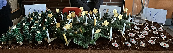 Pünktlich um 15 Uhr wurden die Eltern, Verwandten und Freunde der Kinder von unserer Trommelgruppe herzlich empfangen und anschließend in die festlich gestaltete Pausenhalle geleitet. Dort hatten die Klassen liebevoll gestaltete Stände aufgebaut, an denen die selbstgefertigten Kunstwerke und Leckereien bewundert und erworben werden konnten.