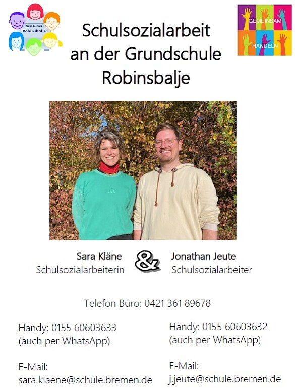 Wir, Sara Kläne und Jonathan Jeute sind das Team der Schulsozialarbeit an der Grundschule Robinsbalje.
